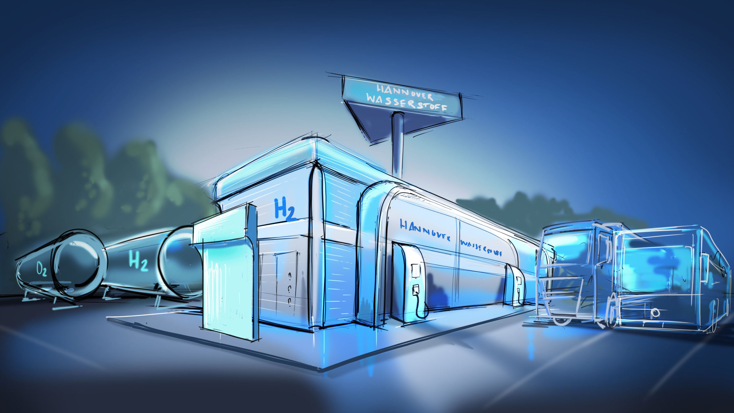 Für die Stadtentwässerung Hannover entwickelten wir das Keyvisual zu der potenziellen Ausgestaltung einer Wasserstofftankstelle. Das strahlende Wasserblau dominiert im Bild und kreiert gemeinsam mit den skizzenhaft angedeuteten Themenobjekten einen modernen Look, der zum innovativen Thema der Energiewende passt.
