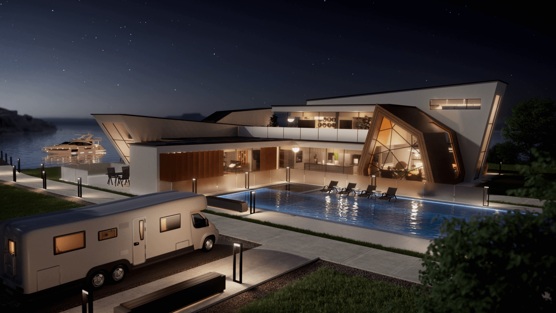 Eine Yacht, ein Wohnmobil und eine Villa. Auch im weiteren Verlauf zeigt das 3D-Produktvideo  Beispiele von der Verwendung von hochwertigen Glasprodukten. Die realistischen Darstellungen von Objekten und Umgebungen, gepaart mit der stimmungsvollen Ausleuchtung der Szenen sprechen eine deutliche Sprache: Mit Ihrem Produkt können Ihre Kunden mehr erreichen. Dabei geht es nicht nur um den materiellen Wert des Gezeigten, sondern um den Mehrwert, den Sie Ihren Kunden verschaffen.