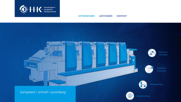 Der Unternehmensauftritt von H&K – Spezialtransporte und grafische Maschinentechnik.