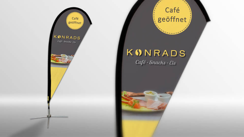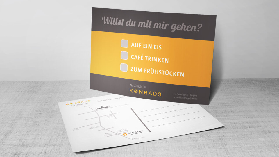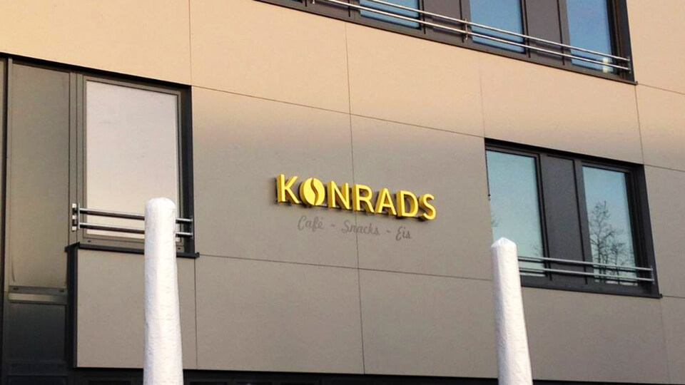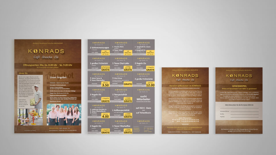 Für unseren langjährigen Kunden „Bäckerei Schultze-Mühlenfeld“ aus Wiefelstede kreierten wir das Logo und Werbemittel des im Jahr 2014 eröffneten Café Konrads.