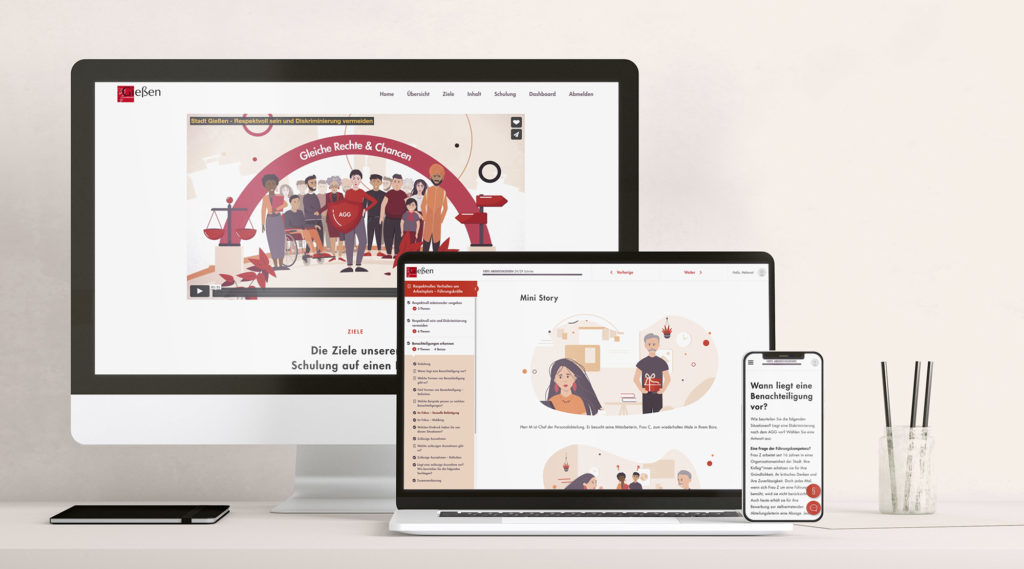 Für die Stadt Gießen fertigten wir eine personalisierte Ausgabe unserer AGG-Schulung auf der Basis von unserem Learning-Management-System LEARNWAY an. Thema der Online-Schulung und Ziel des Allgemeinen Gleichbehandlungsgesetzes (AGG) ist Diskriminierung, Mobbing und Ausgrenzung zu verhindern und für respektvolles Verhalten am Arbeitsplatz sorgen.