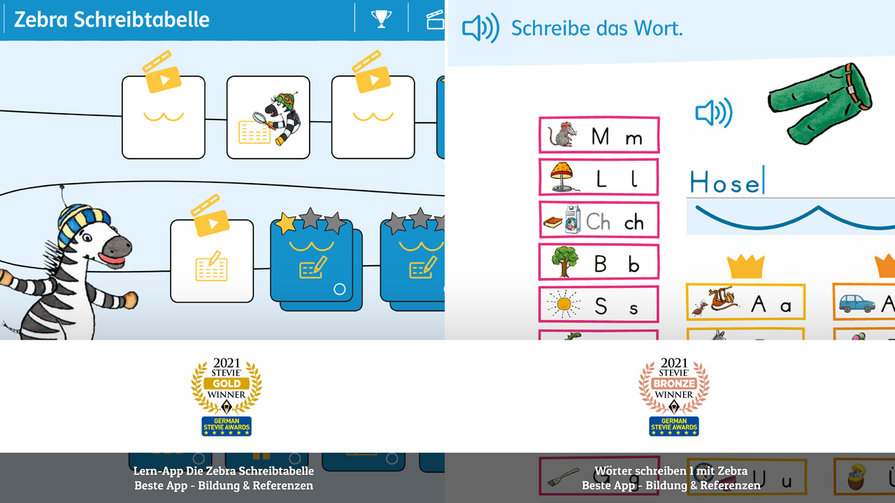 - 2021 Gold Stevie® Award in der Kategorie „Beste App – Bildung & Referenzen“: Lern-App Die Zebra Schreibtabelle