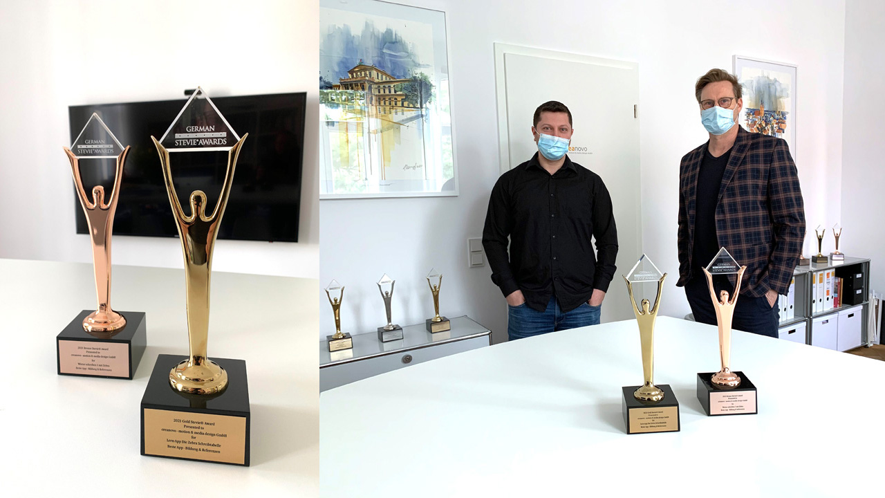 Die creanovo – motion & media design GmbH gewinnt neben den drei Stevie® Awards in den Kategorien „Bestes Video – Ausbildung“ außerdem auch zwei Awards in der Kategorie „Beste App – Bildung & Referenzen“ bei den German Stevie Awards 2021.